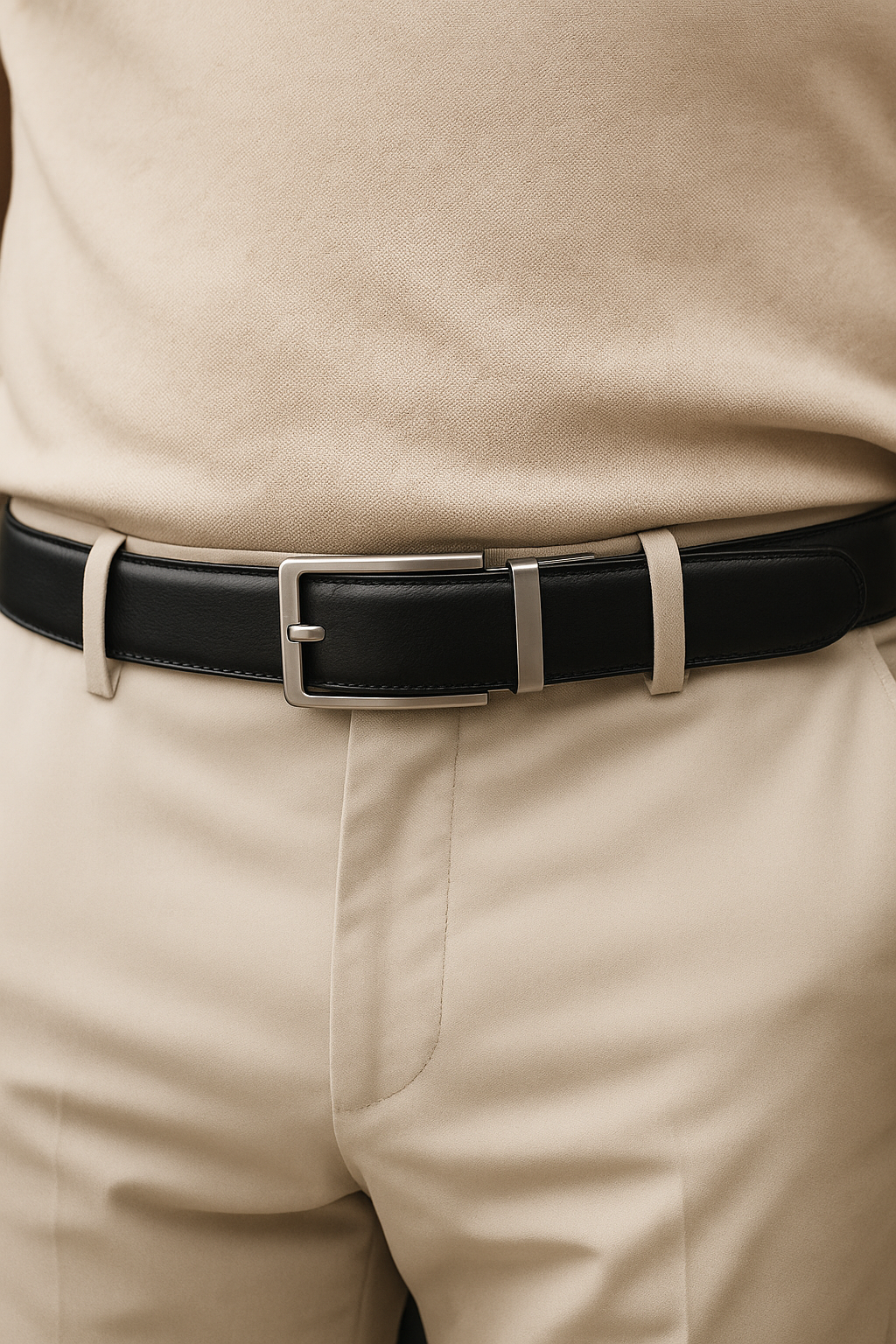 Onze riemen hebben geen gaatjes, maar een intern railsysteem met micro-kliks. Je schuift de riem eenvoudig door de gesp en hij klikt vast op millimeterniveau. Met één druk op de knop maak je hem weer los. Zo heb je altijd de perfecte pasvorm, zonder slijtage.