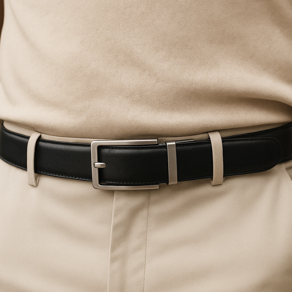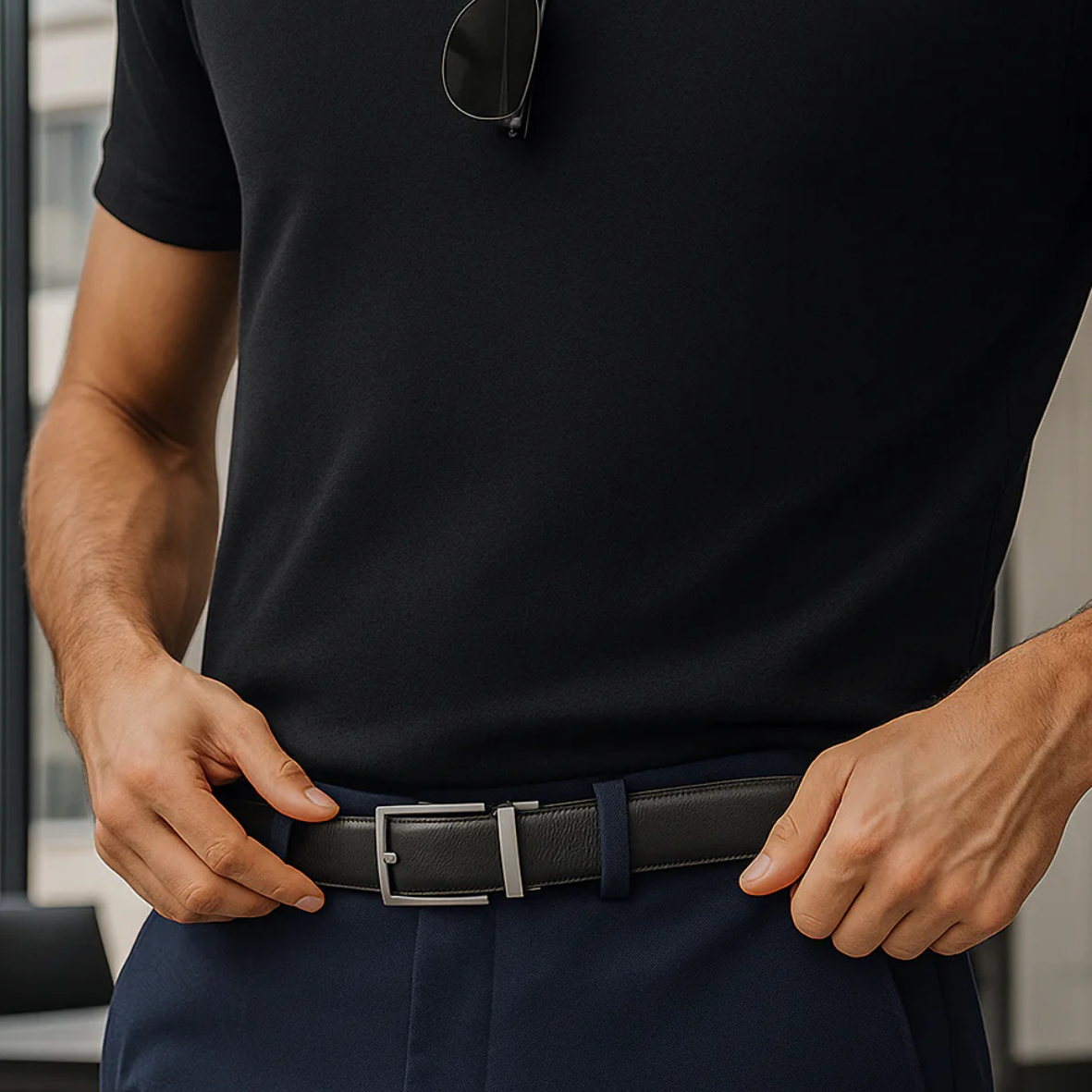 Dankzij het innovatieve kliksysteem stel je de riem moeiteloos af tot op de millimeter nauwkeurig. Hij blijft stevig op zijn plaats, ziet er stijlvol uit en is gebouwd om jarenlang mee te gaan. Dit is de riem die met je meebeweegt — niet andersom.