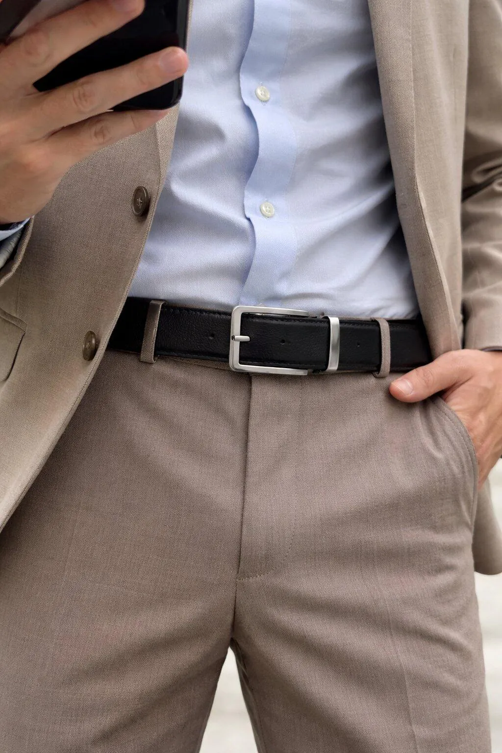 Geen gaatjes. Micro-verstelbaar kliksysteem voor een exacte pasvorm — tot op de millimeter. Pas aan na een maaltijd, lange vlucht of drukke dag. Voor mannen die niets aan het toeval overlaten.